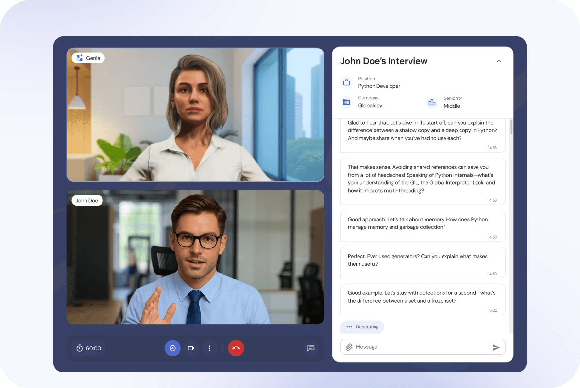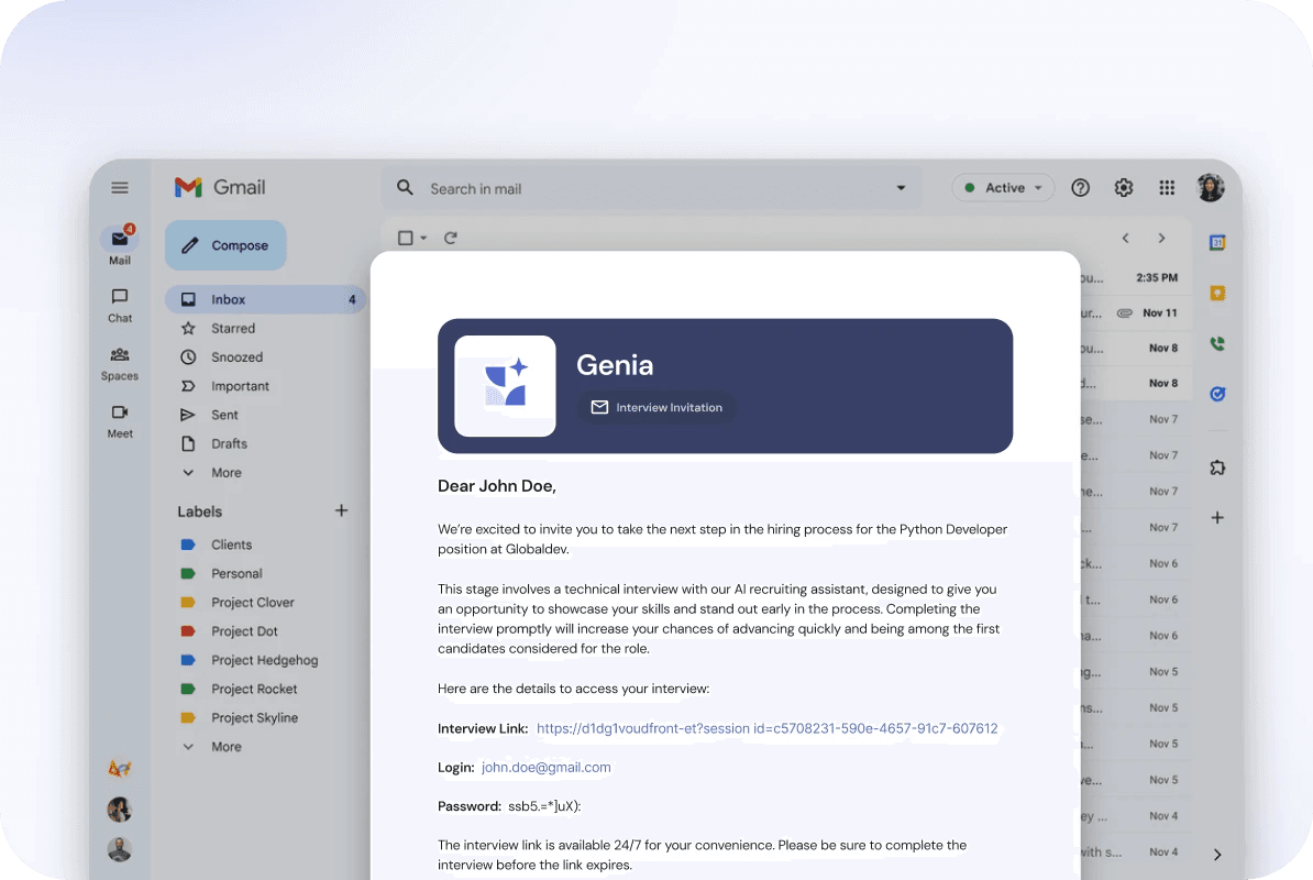 AI interview agents conduct structured first-round interviews autonomously. Tools like Genia ask role-specific questions, adapt follow-ups in real time, and deliver a scored report hiring managers can actually compare. Every candidate gets the same interview. 74% of hiring managers say AI can help assess whether applicant skills match the position and recruiter time shifts to the stages where relationships and judgment matter.