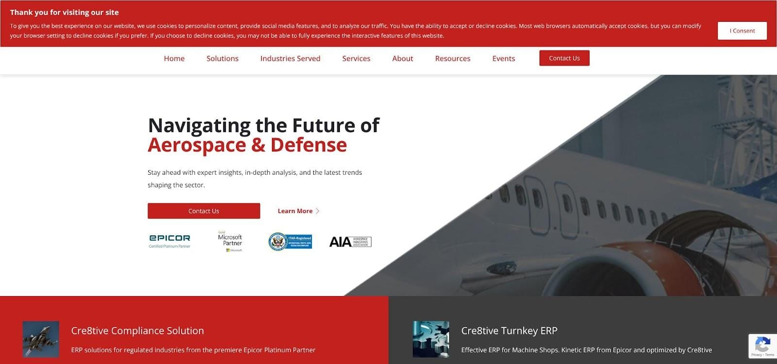Cre8tive Technology & Design Epicor Kinetic aerospace and defense ERP website screenshot.