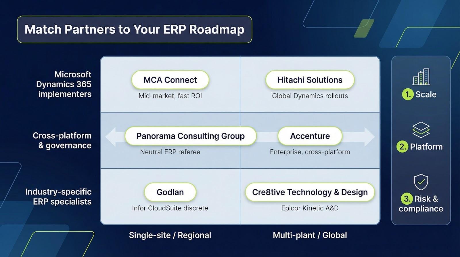 Start with scale. Single-site or regional manufacturers chasing quick ROI gravitate toward boutique specialists. MCA Connect, Godlan, and Cre8tive deliver senior attention, fixed-fee options, and go-live timelines under one year. Global enterprises managing 20 or more plants lean on Hitachi or Accenture for bench depth, multilingual training, and round-the-clock development.
