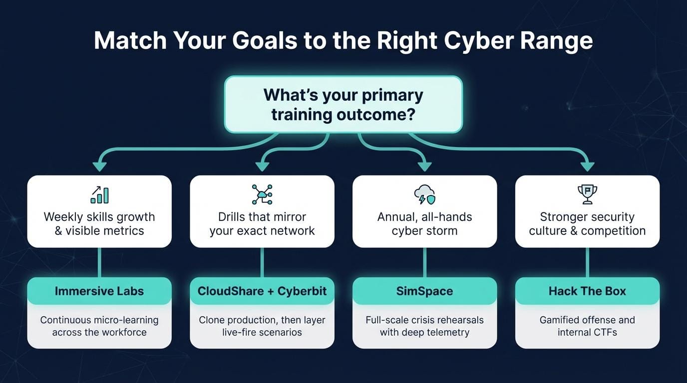 Before you sign a contract, picture where you want to be in 12 months. Are you aiming for sharper SOC reflexes, broader workforce skills, or a board-level war game that proves crisis readiness? Your answer points to a different platform.