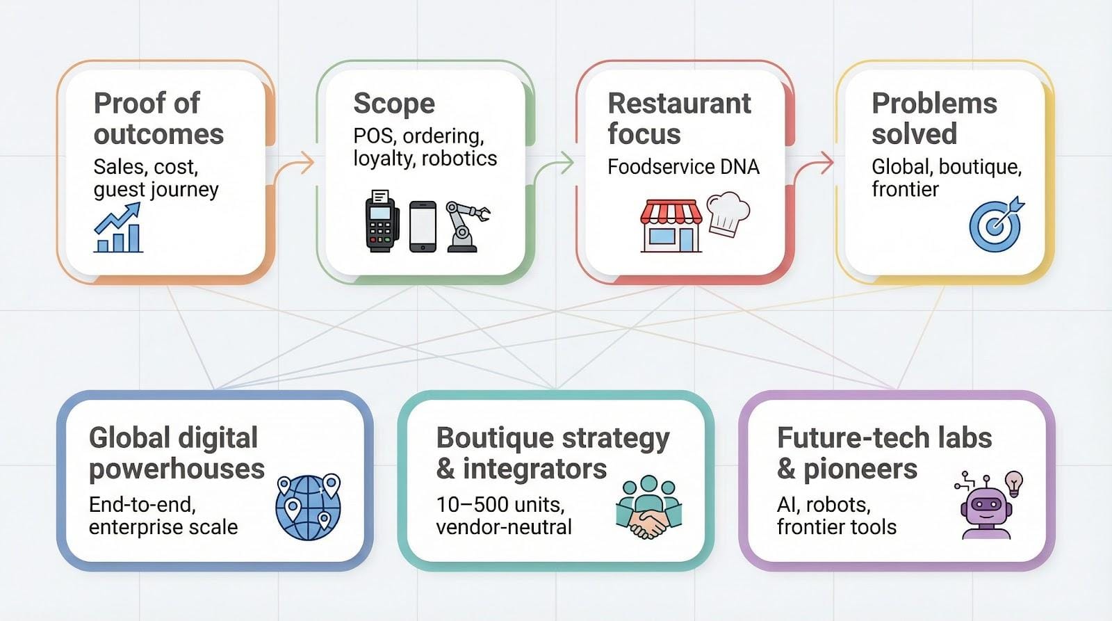 Next, we checked scope. Restaurants juggle POS, online ordering, loyalty, analytics, and emerging robotics. To stay on the list, a consultant had to master at least two of those pillars and speak fluently about API integrations. Pure marketing agencies and single-product resellers were cut.