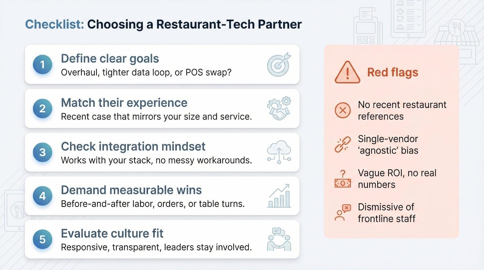 You also want proof of measurable wins. Request before-and-after numbers—a labor-cost drop, an online-order spike, a table-turn lift. Hard data beats glossy decks every time.