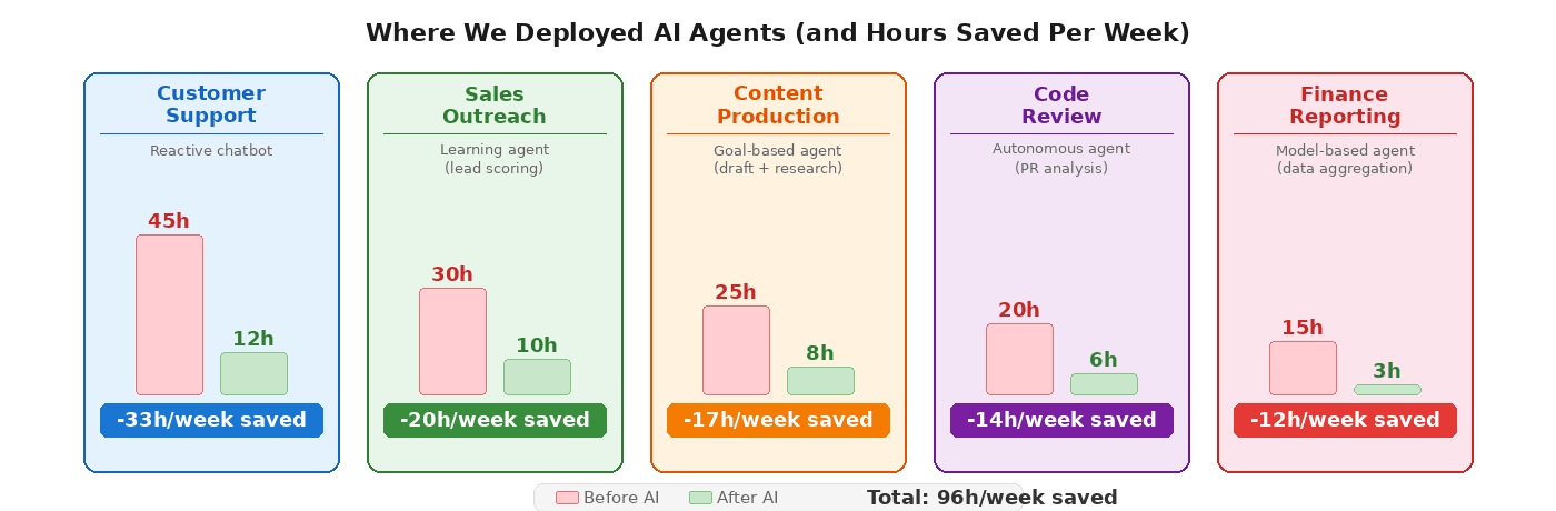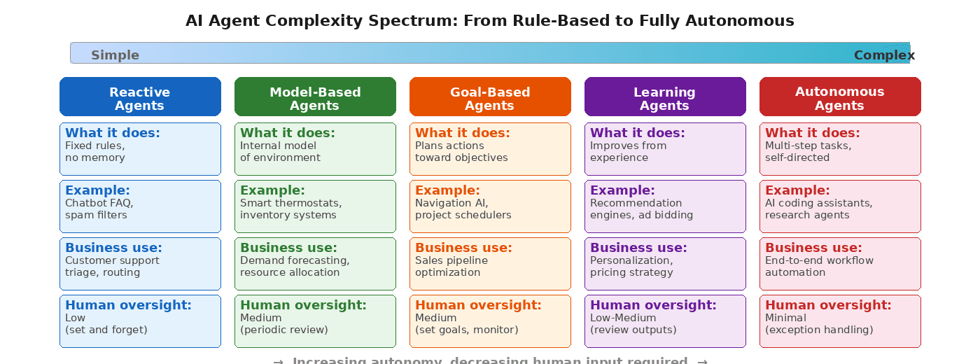 Once I started reading about the different types of AI agents — reactive, model-based, goal-based, learning, autonomous — the picture got clearer. Each type operates at a different level of complexity and autonomy. Matching the right type to the right problem turned out to be the single most important decision we made.